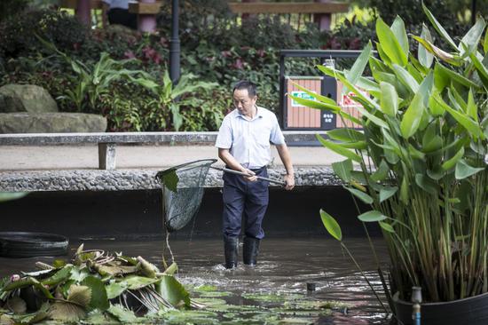 2015年9月15日,流花湖公园内,警察正在案发现场附近的荷花池内打捞物证,进行进一步的勘察。广报记者陈忧子摄